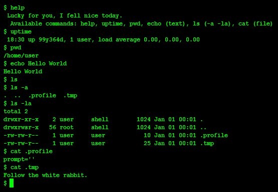 Available commands: help, uptime, pwd, echo (text), ls (-a -la), cat (file)"