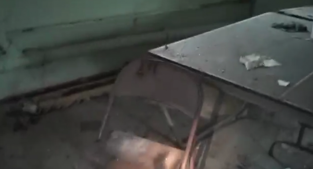 I doubt it's blood. It's possible, but considering the appearance of the rest of the chair, it's probably just concentrated rust. It's a metal chair in a dark, damp basement, after all.[/img]