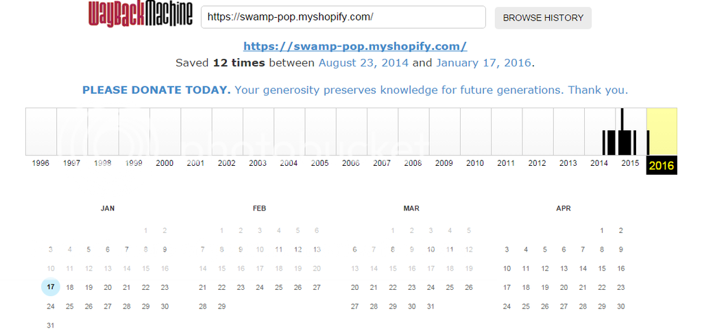 Following the snapshots from the main Swamp Pop website, not the shop, we see that it does have a snapshot from November 2015. However, clicking the "Buy Online!" link on that snapshot just takes us to the closest snapshot of the shopify site to November 2015 which is....
