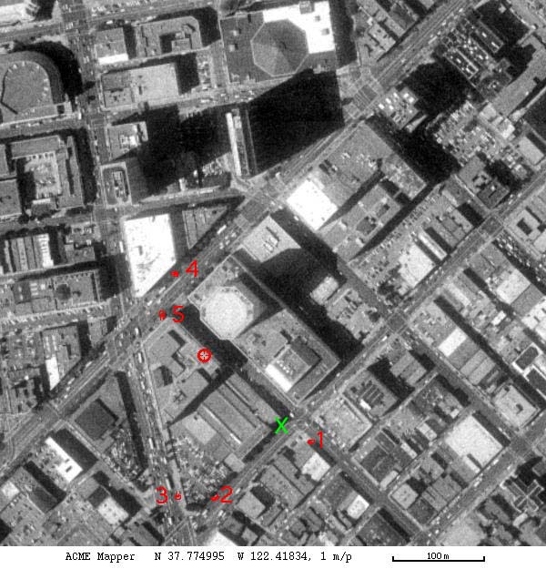 The coords in the map are essentially right at the entrance to the BofA's underground parking garage (nope--no phone in it either--we have physically checked and asked). Since we find nothing there and then proceed to the significantly off-coord phones, we have not stationed anyone at that exact location... yet.