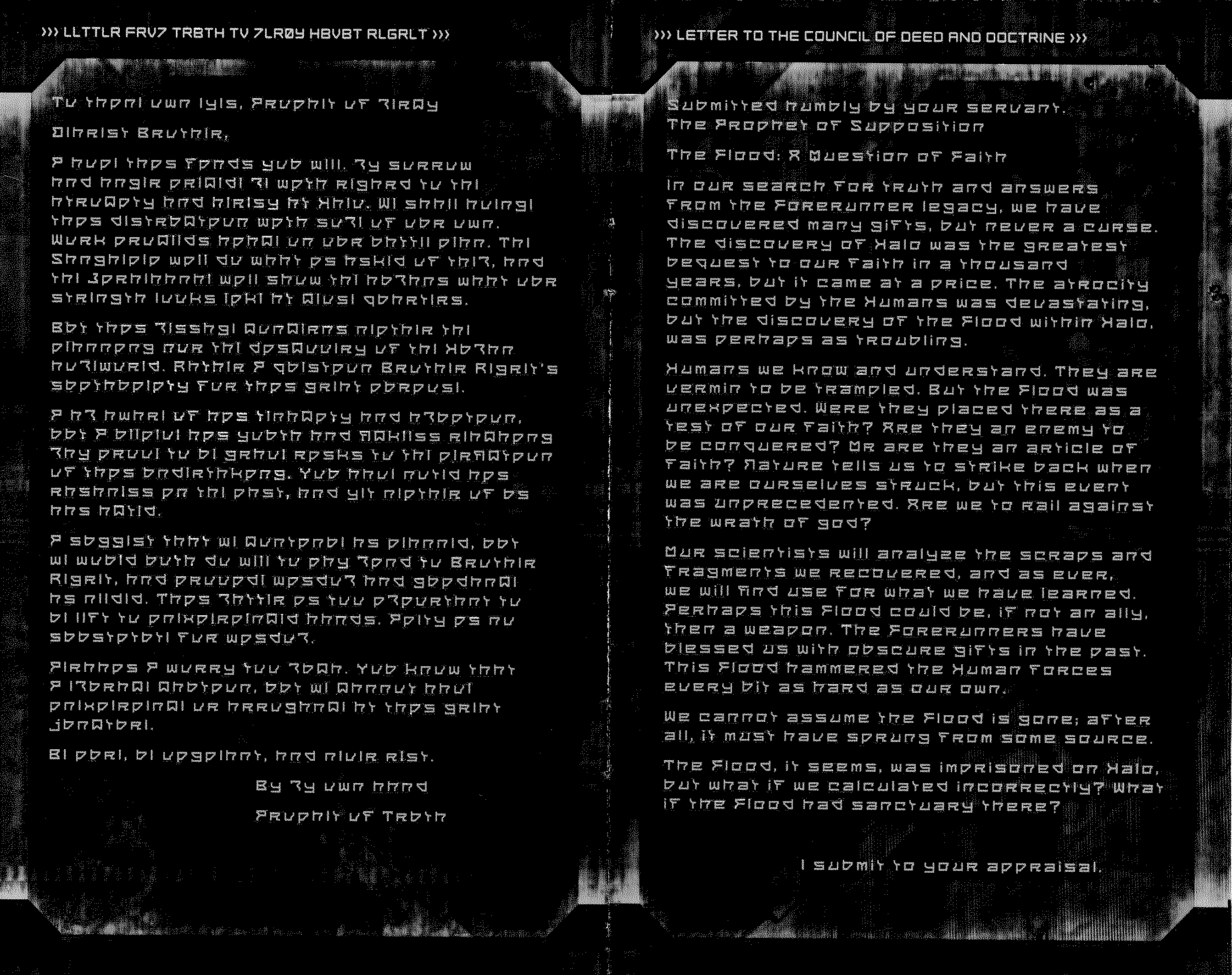 I hope this finds you well. My sorrow and anger precede me with regard to the atrocity and heresy at Halo. We shall avenge those destroyed with some of our own. Work proceeds apace on our battle plan. The Elites will do what is asked of them, and the Brutes will show the humans what our strength looks like at close quarters.